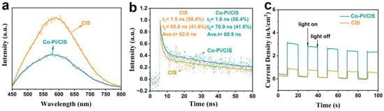 The effect of Co-Pi co-catalysts on the photogenerated charge transfer behavior of CIS was further verified by PL, TRPL, and I-t tests. As shown in Figure 6a, the PL emission intensity of CIS is higher than that of Co-Pi/CIS. This PL fluorescence quenching that occurs in Co-Pi/CIS systems means efficient charge injection from CIS to Co-Pi. TRPL is a powerful tool for exploring the dynamics of light-induced charge carrier transfer (Figure 6b), where τi and Ai represent fluorescence lifetime and amplitude, respectively. The decay kinetics of Co-Pi/CIS shows a longer average emission lifetime (68.9 ns) than CIS (63.9 ns) due to the presence of Co-Pi co-catalyst as a hole acceptor. A photoelectrode is prepared by coating the samples on FTO substrate for photocurrent–time response curve measurement. The significantly enhanced photocurrent density in the Co-Pi/CIS electrode strongly illustrates the accelerated electron–hole pair transfer kinetics (Figure 6c).