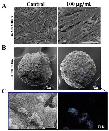 To confirm whether ultrastructural changes occurred after treatment with TiO2 NPs, scanning electron microscopy (SEM) analysis was performed and showed that SAOS-2 in 2D and spheroids (3D) maintained their morphology after 3 days of exposure to TiO2, without changes in their cell–cell contact (Figure 3A,B). Moreover, SEM-EDS analysis confirmed the presence of TiO2 NPs on the surface of both cell models. A detail of interaction of TiO2 NPs with spheroids (Ti-k, marked in blue) can be observed in Figure 3C.