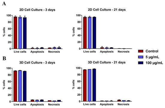 Viability of 2D and 3D human osteoblasts (SAOS-2): SAOS-2 were exposed to TiO2 NPs (100 μg/mL) for 3 and 21 days and the PI/Annexin assay was performed by flow cytometry of cells in (A) 2D and (B) 3D. The baseline condition was used as a control. The results are the mean ± standard deviation of three independent experiments (no statistical difference).