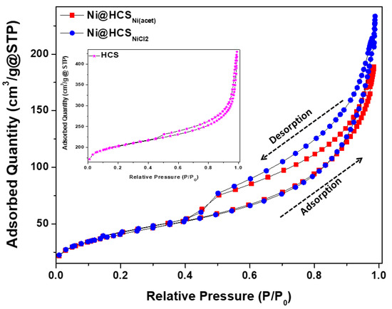 Adsorption isotherms of the Ni@HCSs nanocatalysts. Insert: Adsorption isotherms of pristine HCSs.