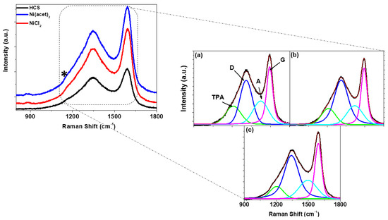 The structural disorder of the HCSs originating from the anchoring of Ni nanoparticles was determined from Raman spectra. Expectedly, the spectra of all samples (Figure 7) showed first-order Raman peaks for carbonaceous materials [51,52,53], with the D-band at 1339–1350 cm−1 and the G-band centred at 1590–1596 cm−1. In addition to the common first-order Raman peaks, the spectra of the nanocatalysts also revealed the presence of other vibrational modes [54,55], as indicated by the shoulder at ~1150–1154 cm−1, as shown in Figure 7 by an asterisk (*). The observed shoulder (*) is assigned to sp3 hybridized carbons of disordered diamond-like amorphous carbon [56,57]. The position and broadness of different vibrational bands in carbon-based nanomaterials can be used as a measure for quantifying local structural disorders [58,59,60]. As such, the positions and bandwidths of all the Raman active modes within the as-synthesized nanocatalysts were determined through peak fitting of their Raman spectra. As shown in Figure 7, the spectra revealed at least four component active modes centred at ~1201–1217 cm−1, ~1339–1350 cm−1, ~1493–1511 cm−1, and ~1590–1596 cm−1, respectively. The lower frequency ~1201–1217 cm−1 bands result from the vibrational mode of transpolyacetylene (TPA)-like structures, indicating the formation of TPA-like chains at the zig-zag edges of defective HCS shells, with the linewidth of the TPA-band being proportional to the number of the zigzag chains [60,61,62,63]. Notably, the linewidth of the TPA-band decreased upon the addition of Ni nanoparticles to the support, and the intensity is observed to be dependent on the type of the precursor salt employed (Figure S3). For instance, the hydrocarbon radicals from the acetate anion facilitated the healing of the HCS shells (Figure 7a), leading to the formation of fewer defective zigzag edges in the Ni@HCSsNi(acet)2 nanocatalysts (Figure 7b). In addition to the TPA-band, broadening of the A-band (~1493–1511 cm−1), especially for the Ni-based catalyst samples suggested high amorphous carbon content in the form of interstitial disordered carbon with sp3 links [60,63]. In particular, the etching effect of the chloride anions on the carbon shell is shown by the broader linewidth of the A-band in the Ni@HCSsNiCl2 nanocatalyst (Figure 7c); an indication of the incorporation of adatoms, carbon radicals, and/or sp3 structures into defective edges of the HCS shells.