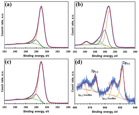 The compositional analysis of the pristine HCSs and Ni@HCSs samples based on the XPS survey scan (Figure S5) correlated with the SEM micrographs indicating that most of the Ni nanoparticles in the Ni@HCSsNiCl2 sample were incorporated inside the carbon shell. The low Ni content in the Ni@HCSsNiCl2 nanocatalysts is attributed to the 5 nm average depth analysis of the XPS instrument, given that the carbon shell of the Ni@HCSsNiCl2 nanocatalysts was estimated to be ~23 ± 4.7 nm. The chemical environments of the carbon atom in the pristine HCSs and Ni@HCSs samples were determined through deconvolution of the C 1s spectra for all samples, as shown in Figure 8. The C 1s spectra were fitted to at least four component peaks corresponding to the sp2 C=C (284.0 eV), amorphous sp3 C-C (285.2 eV), defective C-OH (286.6 eV), and oxygenated carbon edges (288.9 eV) [70,71,72]. The range in the given energy values is the small shifts for each sample. To gain further insight into the correlation between the precursor salt and the Ni nanoparticles, the chemical state of nickel was determined by fitting the Ni 2p spectrum of the Ni@HCSsNi(acet)2 sample (Ni 2p ~0.89 at.%, Figure 8d), despite the low counts for the Ni@HCSsNiCl2 nanocatalysts (0.25 at.%), the binding energy of the Ni 2p3/2 peak located at ~856.4–856.8 eV and that of the Ni 2p1/2 peaks at ~874.2–874.6 eV corresponds to the Ni2+ bonding states of Ni(OH)2 (Figure S6) [73,74,75]. Deconvolution of the O 1s spectra (Figure S7) shows the different bonding states of carbon and nickel with oxygen atoms. For instance, the pristine HCSs samples reveal the presence of vibrations corresponding to quinones (~530.1–531.1 eV), C=O and C–O bonds (~532.6–532.8 eV), as well as terminal O–H bonds (~534.1–534.3 eV) [70,71]. As ambiguous as the interpretation of the O 1s is for hybrid carbonaceous materials, the same could be said for the Ni@HCSs nanocatalysts. In particular, the peak at ~530.1 eV for the Ni@HCSs sample could also be assigned to the chemical state of Ni-O. Additionally, the peak at ~532.1 eV could be associated with the presence of O2- vacancies on the nanoparticles [74,75].