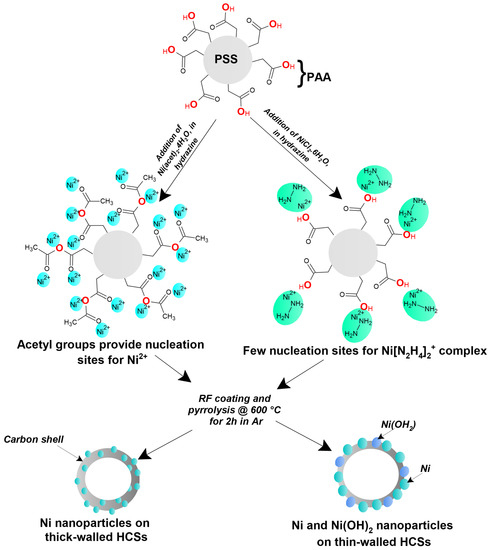 Generally, the results show that the nucleation of the Ni nanoparticles on the HCS shells is influenced by the surface chemistry between the PAA polymer around the PSS template and the Ni-salt precursor, as illustrated in Scheme 1. For instance, the presence of carbon species in the Ni-salt precursor plays a significant role in improving the thermal stability of the Ni@HCS nanocatalysts, despite reducing their subsequent surface area. Typically, nucleation of nickel nanoparticles can be considered to follow a typical reduction of Ni2+ cations to metallic nickel (Equation (1)) by hydrazine in the presence of ethyl alcohol [35,36].