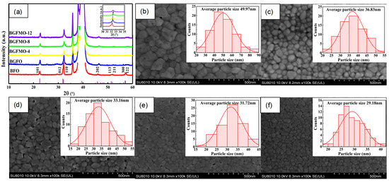 (a) XRD spectrum from BFO to BGFMO-12. The inset shows the redshift peak of (012) and (110). (b–f) SEM micrographs of (b) BFO, (c) BGFO, (d) BGFMO-4, (e) BGFMO-8 and (f) BGFMO-12 films. The insets: Histograms of particle size distribution of different films.