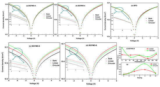 Figure 3a–e shows the J-E curves as /4 plate rotates for BGFMO-4, BGFMO-8 and BFO, respectively. We have measured all samples with each multiple times (Figure S2). Among results, there is a surge increase of light induced current in BGFMO-8. And we can observe the concurrently increasing of either linearly or circularly polarized light induced photo current from Figure 3f. This can lead to two inferences: (i) BGFMO-8 sample is indeed the best one among these samples in terms of photocarrier generation. (ii) Shift and ballistic current is indeed in effect as the origin of and analyzed above. Noted this is an indirect way of measuring the shift current but it makes a simple “proof of principle” type new method that by one-step measuring of the leakage current, one can prove the existence of BPC. The insets from (a–e) of amplified parts clearly show the polarized light arose more carriers, especially in more significant non-centrosymmetrical ones. Moreover, recent studies revealed that the shift and ballistic current can generate longer traveling photo-carriers [42,43], which is distinct from the conventional p-n junction solar cells and also strengthened our proposals. Figure 3f shows the variation of photo current as rotation of /4 plate based on BGFMO-8, and Figure 3g shows the curves of photo current from BFO to BGMFO-12 as codoping increasing, indicating the same trend as in Figure 5b with BGFMO-8 having the largest . While BFO has few photo current, and the sum of ballistic and shift current is the total , as indicated from Equation (4).