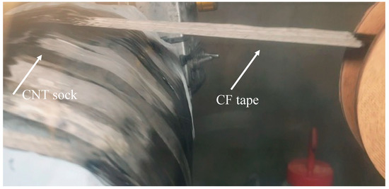 The CF tape can also be layered onto CNT fabric directly from the synthesis reactor. Rolls of CNT-CF tape can be commercially produced. Coating CNT onto CF spread tow tape (30 gsm) may provide new higher-strength composites.