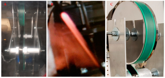 Tape coating and layering machine used for wrapping of CF tape onto CNT. (A) CNT can be coated onto the tape. (B) The red is the reflection of the light caused due to hot sock at the outlet from the reaction process. (C) The CNT web or sock exits the reactor tube and is deposited onto the CF tape and wound from one spool to another in the tape-laying machine.