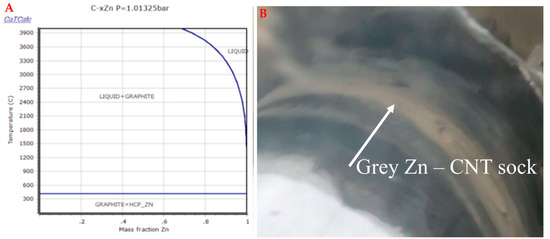 Incorporating nanoparticles into the synthesis process. (A) Phase diagram to describe mixing Zn with C. Zn NPs (60 nm diameter) melt, vaporize, and are deposited on the CNT sheet or inside the CNT. (B) CNT sock winding onto the take-up drum to form a CNT sheet with Zn NPs only in the center (grey-colored strip). The nanoparticles can be functionally graded throughout the CNT fabric.