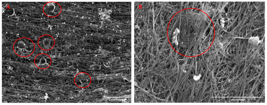 SEM images of CNT cones and spirals. (A) CNT cones in red circles. (B) Spiral CNT in the red circle.