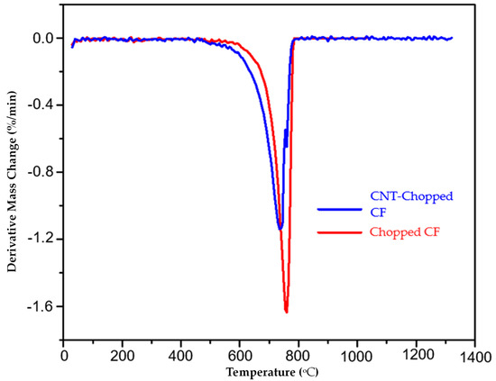 The first derivative of the TG graph for chopped carbon fiber and CNT-integrated chopped fiber.