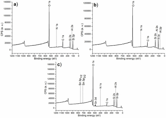 If half of Al was replaced with Sn during the sol–gel process (C3 vs. C2, Scheme 1), both Al and Sn could be detected on the resulting catalyst (C3, Table 1; Figure 1), indicating the two metal ions can be incorporated through the present sol–gel. Furthermore, C3 showed higher content of O as well as lower content of N than C2 (Table 1), emphasizing Sn preferred to accommodate the O-containing ligand (binaphthol) than the N-containing one (melamine) (Scheme 1).