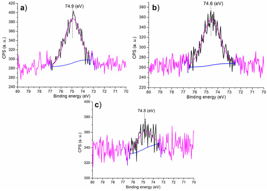 XPS measurement of Al 2p regions for the synthesized catalysts: (a) C1, (b) C2, (c) C3.
