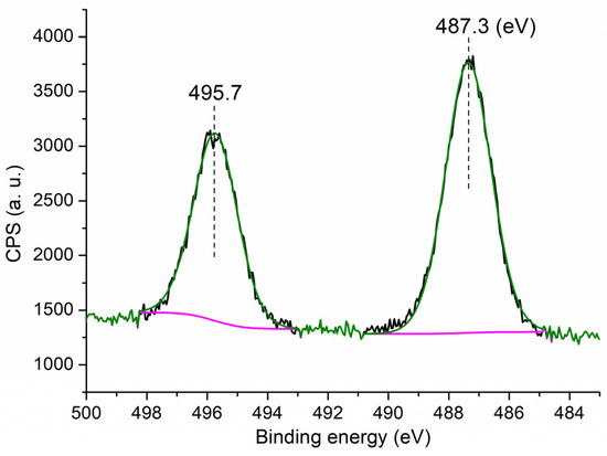 It is interesting to observe the chemical state of Sn on the surface of C3, which may show additional information on the catalytic component of C3. The C3 showed two peaks at 495.8 eV and 487.3 eV on the Sn 3d region (Figure 4), representing binding energies of Sn 3d3/2 and 3d5/2 photoelectrons, respectively, corresponding to the Sn4+ that is contained in the SnO2 phase [35]. In comparison with previously reported data, the binding energy of Sn 3d5/2 photoelectron of Sn2+ was found to be 485.8 eV, and that of metallic Sn was to be 485.3 eV [36]. Therefore, although divalent Sn (anhydrous SnCl2) was employed as the starting material, the Sn of C3 appeared to be tetravalent, probably due to oxidation during the sol–gel process (Scheme 1).