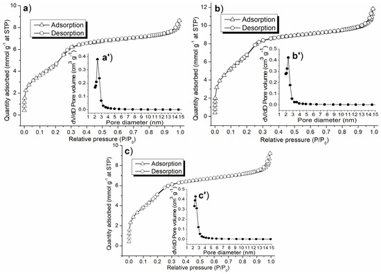Nitrogen adsorption–desorption isotherm and pore size distribution of the synthesized catalyst: (a,a′) C1, (b,b′) C2, (c,c′) C3.