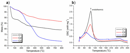 TGA determined the content of organic components in the synthesized catalyst as well as its thermal stability, while DSC characterized the concomitant thermal effect. The C1 showed a weight loss of 11.64% at 30–135 °C (black line, Figure 7a), which was accompanied by a broad endothermic band which appeared at 50–135 °C (black line, Figure 7b), indicating the departure of adsorbed water as well as the attached ligand (melamine) under heating (C1, Scheme 1). The subsequent weight loss of 9.15% at 135–800 °C (black line, Figure 7a) represented removal of less volatile organic residues.