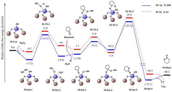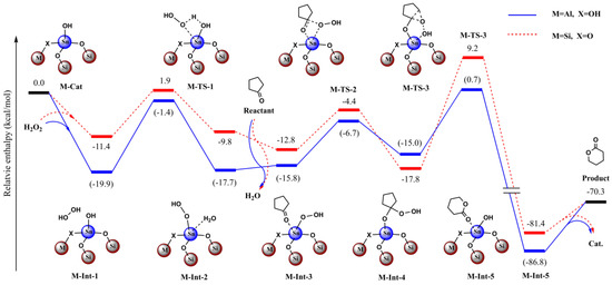 We initially used the simple model (4T structure) which included the open-site Sn atom and four O atoms in the first coordination sphere (with SiH3 or H bound to them) to examine the possible reaction mechanism (Figure 10 and Figure 11, Figures S17 and S18, Section S8, Supplementary Materials). We considered both the stepwise and concerted mechanisms. In the stepwise mechanism, we found H2O2 would more favorably bind with the Sn site and form the Sn-OOH active intermediate via the dehydration (M-Int-2, Figure 9). The oxidation of cyclopentanone and recovery of the Sn-OH catalyst would then occur in the reaction (M-Int-3 to M-Int-5, Figure 9). However, it was found that the concerted oxidation of cyclopentanone without the formation of the Sn-OOH active intermediate would be unlikely due to the higher active energy barrier (not shown). In light of this, we only considered the favored pathway in the following two-layered ONIOM investigation (Figure 10 and Figure 11).