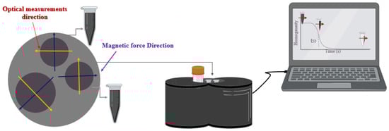 It should be noted that this system includes an optical sensor for measuring the transmitted light, which is produced by an LED array. The opacity of the sample changes over time during the process [36]. To be more precise, the maximum opacity is observed at the beginning of the process (t0) due to the solution’s homogeneity. Half separation time (t50), which is the time when the opacity decreases by 50%, is employed to examine the magnetophoretic behavior of the samples. A schematic illustration of the magnetic separation process is shown in Figure 1.