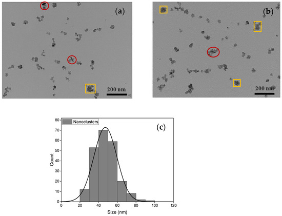 Figure 4a,b show TEM images of the interaction between Ci-MnFe2O4_CTAB-GNRs hybrid NPs (red circles). Since the GNRs coated with CTAB had a positive surface charge, and the manganese ferrite stabilized by a capping agent of citrate had a negative surface charge, it was expected to generate an electrostatic attraction between these NPs (red circles). These results agree with the study by Truby [55], which showed excellent decoration of TREG SPIONs (positive charge) around the surface of the GNRs (negative charge) owing to charge affinity. In addition, small nanoclusters of Ci-MnFe2O4 were formed (yellow rectangular) after adding CTAB-GNRs to Ci-MnFe2O4 due to a charge imbalance in the medium. As expected, only a few CTAB-GNRs are observed compared to Ci-MnFe2O4 in the TEM images of hybrid NPs (Figure 4a,b). The reason could be the low amount of CTAB-GNRs used (0.04 wt%), while the concentration of Ci-MnFe2O4 used was much higher (nearly ten times greater (0.4 wt%) than CTAB-GNRs) in this study. Thus, more Ci-MnFe2O4 compared to CTAB-GNRs was expected to be observed in TEM images. The average particle size of nanoclusters was estimated to be around 48 ± 12 nm, as shown in Figure 4c.