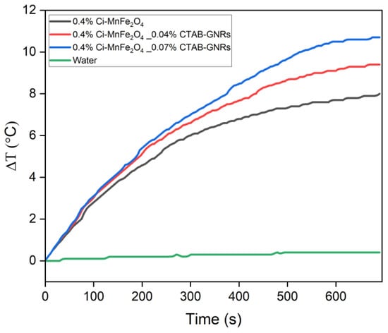 Temperature variation as a time function for Ci-MnFe2O4 and its combination with two different concentrations of CTAB-GNRs.