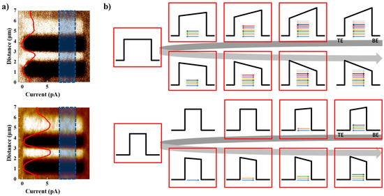 The current for the two aligned regions and the pristine region was then extracted in a region 7 m × 7 m larger than the region, to which the voltage was already applied. A high-performance ultralow current amplifier (ULCA) (Park systems) was used for the exact current extraction. A mapped current–distance image of the ferroelectric material is shown in the top panel of Figure 2a. It is evident from the color that the current levels in the area where −8 V was applied and area where +10 V was applied were different. The red line in the inset of Figure 2a is the current extracted from the blue square area. The current levels were approximately 0.0 pA and 2.4 pA, respectively, in the regions where −8 V and +10 V were applied in advance. These current levels were different to the 1.5 pA extracted from the pristine region. The antiferroelectric (like) corresponding to the lower panel of Figure 2a exhibited the same tendency as the ferroelectric. The current levels were approximately 0.3 pA and 5.4 pA, respectively, in the regions where −8 V and +10 V were applied in advance, and these current levels were different from the 2.9 pA extracted from the pristine region. In both cases, the TER effect was visible with a different current level depending on the voltage applied in advance at the same scan voltage. This implies that the manufactured ferroelectric and antiferroelectric (like)-based devices can be operated as FTJs. In addition, as the measurement results show, ferroelectric and antiferroelectric (like) materials have different levels of current distribution. Wider or numerous transient current peaks can be achieved by combining the switching properties of the two devices. This may provide an advantage in implementing multiple states of resistance-change memory. Figure 2b shows a schematic of Pr control in accordance with an external signal, illuminating the differences between the switching properties of a ferroelectric and an antiferroelectric (like) in terms of potential barrier modulation. In this figure, TE and BE mean the top and bottom electrodes; the position is reported horizontally; the energy vertically, and the arrows represent the pr. In both cases, the process of pointing to the lower electrode was demonstrated by starting with the polarization pointing to the upper electrode and gradually switching the polarization in the opposite direction. The schematic, which is represented as an energy band diagram, for this process contains the following assumptions and conditions. First, the polarizations of both ferroelectrics and antiferroelectrics (like) were polarized in a direction perpendicular to the electrode. Second, the Pr of the ferroelectric was expressed with ten arrows, and the antiferroelectric (like) was expressed with four arrows, which was 40% of the ferroelectric. This was the approximate amount assumed from the Pr value of the P–V curve shown in Figure 1b,c. Third, only the remaining Pr was considered after offsetting the polarization in the opposite direction. A schematic of the ferroelectric polarization switching process when a larger voltage is applied over time is shown in the upper panel of Figure 2b. Similar to the transient current response of the first quadrant of Figure 1b, when the applied external signal was small (when applied about 0.2 V or less), there was no change in the aligned polarization in the initial stage. The aligned polarization was then switched to the opposite direction when additional external signals were applied (when applied more than about 0.2 V), offsetting and reducing the total Pr. Subsequently, as more external signals were applied, the polarization aligned in a direction opposite to the initial state. A schematic of the antiferroelectric (like) polarization-switching process is shown in the lower panel of Figure 2b. Even when the applied external signal was small, the aligned polarization began to switch because the transient current peak spanned to zero, as shown in Figure 1c. In contrast to the ferroelectrics, polarization switching at this time did not switch in the opposite direction but in a non-polar phase. However, the nonpolar phase was not considered separately because it had no impact on the potential barrier. After polarization switching according to the external signal near 0 V, polarization switching occurred again at a specific voltage or higher. A red square was inserted in both the ferroelectric and antiferroelectric (like) states when the electrical resistance state was changed by polarization switching in accordance with the applied external signal. As described earlier, ferroelectric and antiferroelectric (like) materials exhibit different switching characteristics according to the external signals. Thus, the gradual switching characteristic may be improved when ferroelectrics and antiferroelectrics (like) are driven in parallel. This is expected to lead to an improvement in the performance of the resistance-change memory to implement multiresistance states.