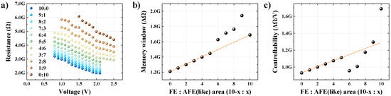 Figure 5a shows the resistance change characteristics of ferroelectric and antiferroe-lectric (like) depending on the area ratio, considering the linearity of the resistance states. The case in which the resistance increased despite the increase in the amplitude of the applied pulse was excluded from the analysis. In addition, it was analyzed only when there was a change in the resistance state of 1% or more based on the memory window. The voltage regions used for analysis according to each ratio are as follows: resistance from 0.8 V to 2.1 V when x was 0 to 5, resistance from 0.8 V to 2.5 V when x was 6 to 7, resistance from 1.0 V to 2.5 V when x was 8 to 9, and resistance from 1.5 V to 2.5 V when x was 10, where x represents the ferroelectric ratio (ferroelectric:antiferroelectric (like) = 10-x:10). The memory window size and controllability, which are the two main parameters of the extracted multiresistance states, can be confirmed in Figure 5b,c, respectively. As shown in Figure 5b, the memory window size tends to increase as the area ratio of the antiferroelectric (like) increases. However, if the area ratio increases to 0:10, which corresponds to a single antiferroelectric (like), the memory window is reduced. This is due to the instability of the antiferroelectric (like) that occurs. It can be confirmed that the memory window size is advantageous at x = 7, 8, and 9, except for x = 10 when the ratio of the antiferroelectric (like) is high. The controllability characteristic of the multiresistance implementation is shown in Figure 5c. At an area ratio of 10:0 to 5:5, the size of the memory window increases; however, the voltage area of the applied pulse, in which the resistance changes is the same, and thus, the controllability parameter increases. This means that the controllability gradually deteriorates from 10:0 to 5:5. However, from 4:6 to 2:8, when the area ratio of the antiferroelectric (like) relatively increases, the controllability parameter decreases. This is because the voltage-controllable area that modulates the resistance state increases simultaneously with an increase in the memory window size. If the ratio of the antiferroelectric (like) increases further, the controllable voltage area decreases, and the controllability parameter increases, thus losing the advantage of controllability. Thus, it was determined that a ferroelectric:antiferroelectric (like) area ratio of 3:7 was the most beneficial for implementing multiresistance states. The memory window increased by 42%, and the controllability showed an advantage of 76.6 MΩ per 1 V compared to the single ferroelectric used for general FTJ. This result suggests that the limitation in implementing the multiresistance states of the existing FTJ can be overcome when the ferroelectric:antiferroelectric (like) has an area ratio of 3:7.