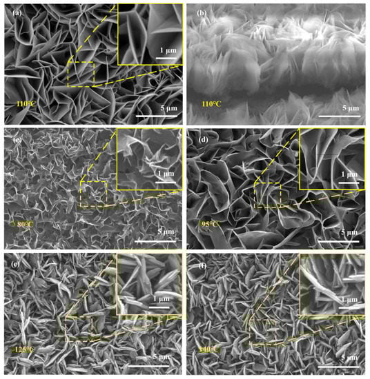 SEM images of supported nanosheet with different hydrothermal temperatures (a) Top-view SEM image of nanosheet arrays grown at 110 °C (b) Oblique-view SEM image of nanosheet arrays grown at 110 °C (c) 80 °C (d) 95 °C (e) 125 °C, and (f) 140 °C. The insets are the high magnification SEM image of the corresponding arrays.