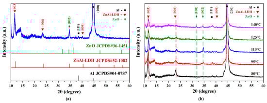 Figure 2 shows the XRD patterns of fabricated nanosheet arrays grown at 110 °C and other hydrothermal temperatures. As depicted in Figure 3a, the intense diffraction peaks represented by black square at 38.4° and 44.7°correspond to the (111) and (200) planes of the Aluminum substrate (JCPDS 04-0877). The diffraction peak represented by the olive diamond at 34.5°corresponds to the (002) plane of ZnO (JCPDS 36-1451), confirming the formation of ZnO. Meanwhile, no other orientated peak corresponding to the crystallographic plane of ZnO was observed, suggesting that ZnO grew preferentially along the C axis and was perpendicular to the substrate. The additional diffraction peak represented by the red inverted triangle at 11.6°, 23.6°, and 39.4° corresponds to the (003), (006), and (009) planes of ZnAl-LDH (JCPDS 52-1082), confirming the formation ZnAl-LDH at the interface of the ZnO nanosheet arrays and Aluminum substrate, as generally reported in the literature []. Comparative XRD studies of supported nanosheet arrays grown at various hydrothermal temperatures in Figure 3b reveal the hydrothermal temperature effects on the structural characteristics of supported ZnO nanosheet arrays. It is clear that with increasing hydrothermal temperature, the intensities of the diffraction peaks corresponding to ZnAl-LDH continuously decrease while the intensities of diffraction peaks corresponding to ZnO increase, indicating that a higher hydrothermal temperature is conducive to the fast formation of ZnO nanosheet arrays. Moreover, the intensity variations of diffraction peaks corresponding to (002) and (100) for ZnO suggest the growth process of ZnO nanosheet arrays. When the hydrothermal temperatures increase from 80 °C to 110 °C, the (002) peak’ intensity gradually increases, suggesting the nanosheet radial growth that is perpendicular to the substrate and resulting in the increment of the nanosheet area. When the hydrothermal temperatures increase from 110 °C to 140 °C, the (100) peak’ intensity becomes obvious, suggesting that the nanosheet axial growth was parallel to the substrate and resulting in the increment of nanosheet thickness. These results from XRD analysis are in agreement with the aforementioned morphological analysis.