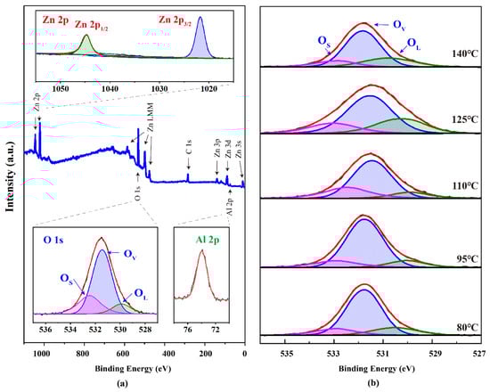The composition and elemental states of various ions present in as-fabricated supported ZnO nanosheet arrays were identified by XPS analysis. Figure 3a demonstrates the XPS spectrum of supported ZnO nanosheet arrays grown at 110 °C. Major spectral lines and auger lines in the survey XPS spectrum (Figure 3a) are labeled [,], which indicates that the sample was composed of Zn, O, and Al. A weak C 1s emission peak can be observed in the spectrum, which results from the sample holder and adventitious carbon present on the essential sample surfaces exposed to the environmental air. No peaks of other elements can be observed. From the wide scan of the XPS spectrum in Figure 3a, it can be seen that the XPS spectrum exhibits two apparent peaks related to Zn 2p, and O 1s, indicating that the main components of the nanosheet array are Zn and O elements. Meanwhile, the delicate peak appearing at the 74 eV related to Al 2p suggests the presence of trace Al elements. To provide more details of the composition and elemental states, the narrow scans of these characteristic peaks were analyzed by peak fitting and separation. For the narrow scan of Zn 2p, Zn 2p1/2 and Zn 2p3/2 peaks are located at 1044.7 and 1021.5 eV. The spin-orbit splitting between the two peaks is 23.2 eV, indicating a Zn2+ oxidation state in the ZnO wurzite lattice []. For the narrow scan of Al 2p, the symmetrical peak of Al 2p is located around 74.0 eV, suggesting that Al3+ ions formed Al–O bonds. Furthermore, as shown in the narrow scan of O 1s, three fitted peaks at 532.3 eV (OS), 531.3 eV (OV), and 529.7 eV (OL) are found and relate to oxygen adsorption and loosely bound oxygen (OH), oxygen vacancies in ZnO and Al–O bonds, and the lattice oxygen in the ZnO wurzite, respectively []. Figure 3b represents variations of the O 1s narrow scan with different hydrothermal temperatures. An increment in the proportion of OL-fitted peaks can be clearly seen with increasing hydrothermal temperatures and indicates the formation of ZnO wurzite. In addition, the proportion of the OL-fitted peak grown at 110 °C achieved a maximum value, suggesting the strongest adsorption of oxygen and OH (H2O) on the surface. In addition, as can be seen from Figure S4, the binding energy of Al 2p and Zn 2p is almost unchanged with increasing hydrothermal temperature. However, the ratio of them becomes smaller, which indicates that the proportion of zinc element gradually increased, while the proportion of the aluminum element gradually decreased.
