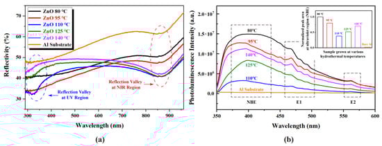 Figure 4 demonstrates how the UV-Vis reflection and PL spectrum of bare Al substrate and fabricated nanosheet arrays are grown at various hydrothermal temperatures. From Figure 4a, it can be seen that compared with the bare Al substrate, as-fabricated ZnO nanosheet arrays have almost lower reflectance over the spectral range of 300–900 nm, indicating better absorptions of ZnO nanosheet arrays. In particular, the reflection spectrum of the ZnO nanosheet array grown at 110 °C exhibits two deep reflection valleys near 325 nm and 850 nm. These two reflection valleys are located in different spectral regions, and the physical mechanism of their generation is also different. The reflection valleys at 850 nm in the near-infrared region are mainly due to the inter-band transition of Al [], which can also be obviously observed in other ZnO nanosheet arrays and bare Al substrates. As a comparison, the reflection valleys at 325 nm in the ultraviolet region only appear in the reflection spectrum of the nanosheet array grown at 110 °C, which is attributed to the high ultraviolet light absorptions of the ZnO and ZnAl LDH interlayer.