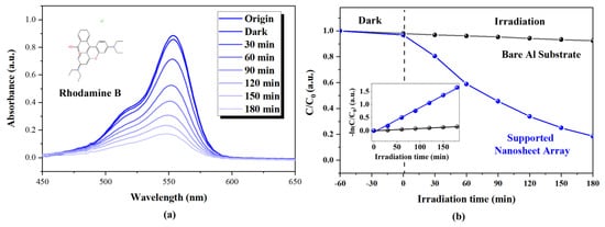 (a) Changes in UV-Vis absorption spectrum of photodegraded RhB solution with supported nanosheet arrays grown at 110 °C as a function of irradiation time (b) RhB concentration changes over bare Al substrate and supported nanosheet arrays as a function of irradiation time. The inset is the pseudo-first-order kinetic fitting plot of photodegradation.