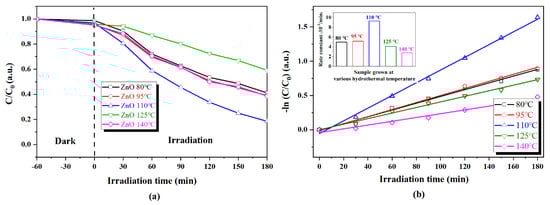 In order to evaluate the hydrothermal temperature effect on the photodegradation activity of fabricated supported nanosheet arrays, the photodegradation experiment of RhB dye pollutions with supported ZnO nanosheet arrays grown at other hydrothermal temperatures were carried out, and the results are shown in Figure 6. The changes in the UV–Vis absorption spectrum of the photodegraded RhB solution as a function of irradiation time with supported nanosheet arrays grown at 80 °C, 95 °C, 125 °C, and 140 °C are shown in Figure S5. It can be clearly observed from Figure 6a that the photodegradation activities of ZnO nanosheet arrays depended strongly upon hydrothermal temperature. The photocatalytic activity increased first with the increasing hydrothermal temperature from 80 °C to 110 °C and then decreased with the further increasing hydrothermal temperature from 110 °C to 140 °C, indicating the presence of an optimal hydrothermal temperature. This nonlinear dependence between photocatalytic activity and hydrothermal temperature can be attributed to the influence of competition between the area and thickness of ZnO nanosheets at different hydrothermal temperatures. It is well known that the excellent photodegradation performance of nanosheet arrays is mainly due to their large specific area and atomic thickness []. The larger the area, the more active sites can be provided. The thinner the thickness, the faster the charge transfer and the lower the recombination rate. As mentioned above, the area and thickness of the nanosheet gradually increased with the increasing hydrothermal temperature. When the hydrothermal temperature increased from 80 °C to 110 °C, the positive influence brought by the increase in the area was a major factor and led to the enhancement of photocatalytic performance. When the hydrothermal temperature was further increased from 110 °C to 140 °C, the negative effect of the increasing thickness greatly reduced the charge transfer and, thus, ultimately decreased the photocatalytic activity of ZnO nanosheet arrays.