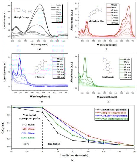 Changes in the UV-Vis absorption spectrum of photodegraded various pollutants with supported nanosheet arrays grown at 110 °C as a function of irradiation time (a) MO (b) MB (c) OFL (d) NOR, and (e) Pollutants concentration changes as a function of irradiation time.