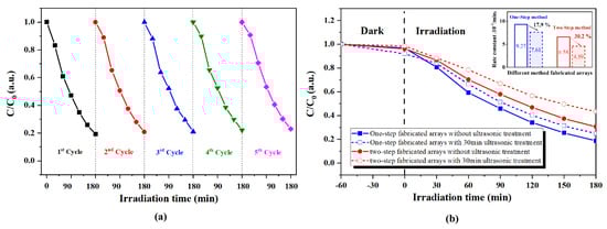 (a) Photocatalytic recycling test of supported nanosheet arrays (b) Comparison of photocatalytic durability test between one-step and two-step fabricated and supported nanosheet arrays.