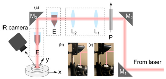 To observe the heating, five different intensities were selected, taking into account the maximum and minimum powers delivered by the lasers. Through the corresponding lens systems, the laser spot diameters were adjusted to 1900 μm and 1300 μm. Using these two different sizes allows one to acquire measurements using the same laser intensity, while providing almost a two-fold difference in power. A smaller area of incidence leads to a decrease in the power so as to maintain a constant intensity, and vice versa. The following Table 2 shows the powers and intensities used, which are within the range of values frequently used in the literature [10,13,18,22,23].