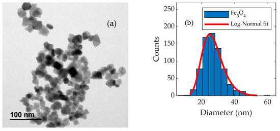 Figure S1 in the Supplementary Materials shows the spinel structure’s typical diffraction pattern, which corresponds to Fe3O4 (JCPDS 01-088-0866). The mean particle size was determined to be 27 ± 2 nm by means of the Scherrer formula.