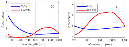 The Fe3O4 and IRA 980B absorption spectra, at the concentration used for the photothermal characterization, were measured using the spectrophotometer (Figure 4). The backgrounds of the water and cuvette (or 2.5% ethanol in the water and cuvette) were also measured and removed from the whole sample absorption. As observed, the absorbance of Fe3O4 is smaller than that of IRA 980B. It is worth noting that the absorbance A at 800 nm is smaller than at 1053 nm for both materials (AFe304(800) = 0.3834; AIRA 980B(800) = 0.5721; AFe304(1053) = 0.4632; AIRA 980B(1053) = 0.8794). Vertical black lines at 800 nm and 1053 nm (laser wavelengths) were also drawn.