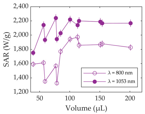 Figure 5 shows the behavior of the SAR as a function of the volume. As can be seen, the SARs fluctuate at volumes smaller than 100 µL for both wavelengths, preventing consistent and comparable measurements at these small volumes. However, above 100 µL, the SARs become independent of the volume and stabilize at around 1850 W/g and 2150 W/g for 800 and 1053 nm, respectively.