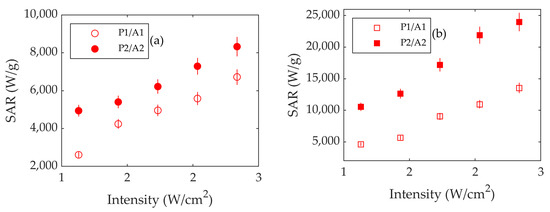 To verify whether the intensity, power, and irradiated area also play a role in heating a molecular solution, the same experiment as that described in Section 3.2.1 was carried out using the power, areas, and intensities in Table 2. The results are shown in Figure 8 and, again, the higher the intensity is, the higher the SAR will be at both wavelengths. As can be seen, for a given intensity, the SAR is again higher for a higher power and spot area.