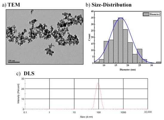 MNPs were prepared using our previously reported KHB method [10,11], as illustrated in Figure 1. Briefly, the sequential in situ basic hydrolytic precipitation of iron salts (Fe3+ and Fe2+) in the presence of hexylamine and ammonium hydroxide NH4OH base afforded stable aqueous dispersions of Fe3O4-MNPs. The obtained MNPs were characterized by various electronic and spectroscopic techniques including transmission electron microscopy (TEM), dynamic light scattering (DLS), X-ray diffraction (XRD), and vibrating sample magnetometry (VSM). These techniques clearly revealed the structure, morphology, and magnetization of the as-synthesized Fe3O4-MNPs. TEM and high-resolution TEM (HR-TEM) images (Figure 2a) clearly indicate the quasi-spherical morphology and highly crystalline nature of the NPs, with well-defined interfringe spacings in their crystalline lattices. Figure 2b shows the particle size distribution associated with the TEM image. As shown, the narrow size distribution confirmed the monodispersity and homogeneity of the as-synthesized MNPs with average sizes of ~15 nm. The DLS of samples dispersed in water was then recorded (Figure 2c), showing an average hydrodynamic (DH) size of 105 ± 2.48 nm. The average polydispersity index (PDI) was found to be 0.3, further confirming the homogenous size-distribution, uniformity, and good dispersity of the MNP samples in aqueous media.