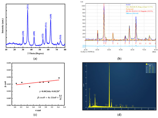 (a) XRD patterns; (b) Rietveld analysis; (c) Williamson–Hall method; and (d) EDX spectrum of the synthesized Fe3O4 MNPs.