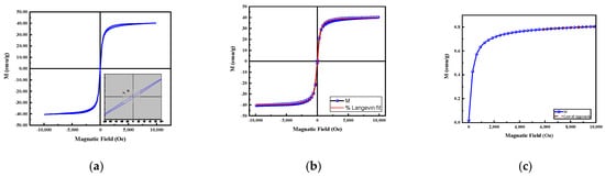 where is the saturation, is the nanoparticle magnetic moment, T is the temperature (300 K), and is the Boltzman constant. Figure 4b shows that the experimental magnetization (M–H) curve fitted well with the Langevin equation, confirming the superparamagnetic behavior.