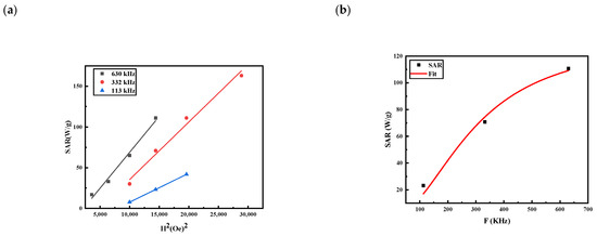 LRT model fitting the experimental SARs (a) with the square of field amplitude and (b) with the frequency at field H0 = 120 Oe using Equation (12).