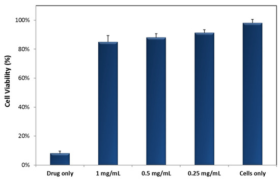 The cell viability of MDA-MB-231 cells treated with MNPs was determined using the MTT assay. The cell lines were seeded in a 96-well plate at a density of 5 × 105 cells/well and incubated in 95%/5% humidified air/CO2 at 37 °C. After 24 h, the media were removed and fresh phenol-red free DMEM containing 0.5% FBS was added to the cells. The cells were then treated with different concentrations of Fe3O4-MNPs (1, 0.5, and 0.25 mg/mL) along with a free anticancer drug, doxorubicin (5 µg/mL), to display cell death. After 24 h of incubation, the media were removed and the cells were washed with PBS. The cell viability was then determined using the MTT viability assay in accordance with the manufacturer’s protocol. Briefly, 20 µL of the MTT reagent (5 mg/mL) was added to each well and kept for 4 h at 37 °C in the incubator. The supernatant was then removed, and the MTT formazan was dissolved in dimethyl sulfoxide. The absorbance was measured on an iMark micro-plate absorbance reader at 590 nm. The percentage of viable cells was calculated as the ratio of the absorbance of the treated group, divided by the absorbance of the control group, multiplied by 100. The absorbance from the untreated control cells was set as 100% viable.
