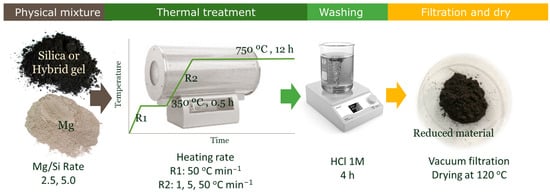 In all cases, the mixture of Mg and silicon precursor was heated in a tubular furnace under an inert atmosphere (i.e., Ar, 300 mL min−1). Since the sol-gel materials synthesized for this study exhibit well-defined porous properties, three different heating rates were employed to evaluate their influence on them. An initial heating rate of 50 °C min−1 was used in all cases to reach 350 °C, and this temperature was maintained for 30 min. Afterwards, a second heating rate of either 1, 5 or 50 °C min−1 was used to reach 750 °C. This final set point was maintained for 12 h. The final treatment temperature and time of reaction were not varied in this work. The obtained samples were washed for 4 h under stirring with a hydroalcoholic solution of HCl 1M (HCl:H2O:EtOH molar rates 0.7:4.7:8.9) to eliminate subproducts MgO, Mg2Si, and Mg2SiO4 [6,40]. Finally, the reduced materials were dried at 120 °C. Figure 1 shows a schematic representation of the complete magnesiothermal process. These materials are identified by placing an “r” before their name to indicate that it is the reduced sample, followed by the heating rate used in the reduction process. For example, rHG/85-5, corresponds to the material obtained from the reduction of HG/85 (C-Si hybrid material with 85wt% of silicon) using a heating rate of 5 °C min−1.