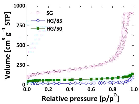 Figure 2 shows the isotherms of the silica and C-Si hybrid gels. As expected, silica gel shows a type IV isotherm, with a main pore size in the mesomacropore range and a high development of micropores. In comparison, the shape of the isotherms of the C-Si hybrid gels corresponds to type II, typically of macroporous materials [42]. This difference is attributed to the interaction between organic and inorganic species. In the C-Si hybrids, the polymerization occurs quickly, which leads to the formation of big nodules with a more open porous structure that avoids the collapse produced during the drying step. The small presence of micropores in C-Si hybrids, which varies between HG/50 and HG/85, can be attributed to the microporosity created in the organic part during carbonization. Thus, the C-Si hybrid with a higher percentage of carbon has higher micromesoporosity (Figure 2 and Table 2). Regardless of the different distribution of the pore size, all of them have a similar percentage of porosity (Table 2).