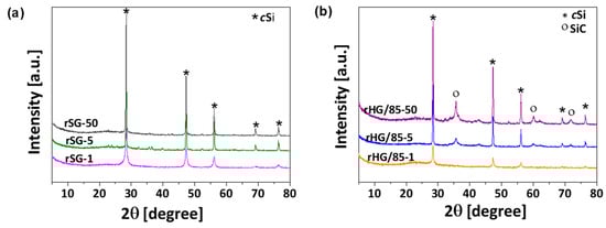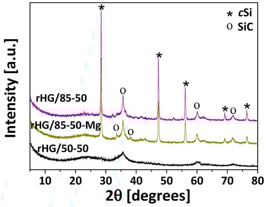 The Mg/Si molar ratio has a great influence not only on the magnesiothermal reduction in silica gels but also on the reduction of C-Si hybrid gels. The XRD patterns of the reduced hybrid gels are shown in Figure 3. Regardless of the Mg/Si ratio, the reduced hybrids HG/85 (rHG/85-50 and rHG/85-50-Mg) exhibit peaks at 2θ of 28.4°, 47.4°, 56.2°, 69.1° and 76.4°, which correspond to the (111), (220), (311), (400) and (331) planes of cSi [16,30,43,44], and peaks at 35.6°, 60° and 71.8° which belong to the (111), (220) and (311) planes of SiC [40,43]. Therefore, these results confirm the presence of the cubic crystalline phase in both species (i.e., Si and SiC). In addition, a higher presence of carbon in the C-Si hybrid precursor (Table 2) promotes the formation of SiC during the reduction process, as in rHG/50-50, only this species (i.e., SiC) can be appreciated in the diffractogram. This is due to the higher availability of C and the consequent Si/C molar ratio of less than one (Table 2) that drives the reduction reaction towards the formation of SiC.