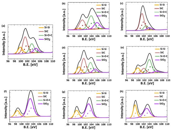 These results were corroborated with XPS analysis. Figure 4 shows the deconvolution applied to the Si 2p spectra of the reduced materials. Regardless of the Mg/Si ratio, the reduced hybrids HG/85 (rHG/85-50 and rHG/85-50-Mg) show four main peaks at 104.7, 103.4, 101.4 and 99.8 eV (Figure 4a,b), attributed to SiO2, Si-O-C, SiC and Si-Si moieties, respectively [45,46] (dotted curves correspond to the splitting signal of Si species). However, differences in the concentration of each one were observed due to the Mg/Si ratio. The reduced material prepared with the lower ratio (i.e., rHG/85-5) shows lower contents of oxidated compounds and a higher concentration of the species of interest, SiC and Si (Table 3), which is related to a better reduction reaction efficiency. These results are in good agreement with the trends reported for the reduction of silica materials [27].
