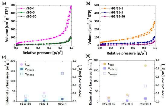 The influence of the heating rate during the reduction reaction also has a significant impact on the textural parameters of the resulting materials. The isotherms of the rSG and rHG/85 materials using the three different heating rates are shown in Figure 6a,b, respectively. Regardless of the textural properties of the precursor, all the reduced materials show type II isotherms. Therefore, it can be concluded that, in all of them, a microporous [10] structure was obtained [42]. These results make it clear that the reduction process has a great influence on the final porosity, even higher than the precursor material itself. Moreover, regardless of the precursor, there is an increase in nitrogen adsorption at low and high relative pressures by decreasing the heating rate. This means that slow heating favors the presence of small pore sizes due to the gradual development of crystals. In the case of silica gels, the gradual reaction helps to maintain the porous structure of the precursor and preserve mesopores, while the formation of aggregates at higher rates favors the creation of pores at approximately 200 nm [28,49]. For C-Si hybrid gels, small pores are formed during the reduction treatment, probably due to the elimination of undesirable subproducts (i.e., MgO), leading to pores of sizes comparable to the crystals formed. A similar phenomenon has been reported in the reduction of nonporous silica materials [30,50,51]. Figure 6c,d show the resultant trend in the textural properties based on the heating rate employed (i.e., external surface area, meso- and micropore volume). As for silica, the main difference between C-Si hybrids reduced at different heating rates is the mesopore volume and its correlated external surface area (Sext) increases at low heating rates. It is worth remarking that, although the reduction process greatly affects the chemical structure depending on the base material employed (silica or C-Si hybrid gels), its effect is not that significant on the final porosity.
