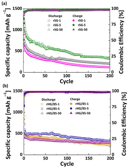 Specific capacity and Coulombic efficiency versus cycle number from the galvanostatic cycling at 500 mA g−1 of rSG- (a) and rHG/85-based (b) electrode series.