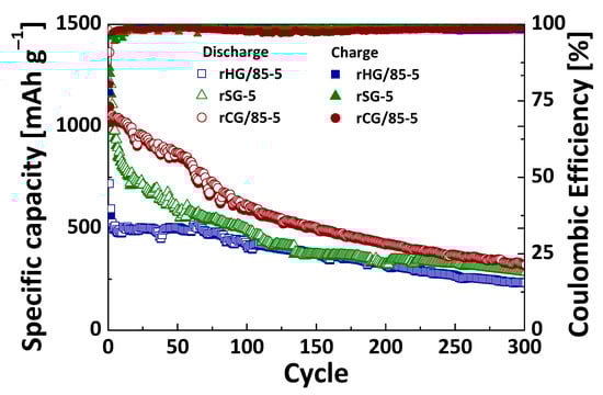 Initial capacity, irreversible capacity in the 1st cycle (Cirr, %) and capacity retention (R, %) obtained from the galvanostatic cycling at a current density of 500 mA g−1 of rSG- and rHG/85-based electrode series.